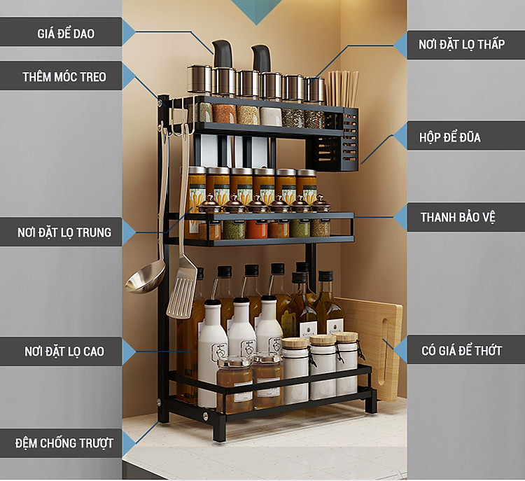 ️ (Tầng dưới để các chai lọ cao như mắm, dầu v.v.., tầng trên để các loại lọ thấp như muối, hạt nêm, gia vị khác ).