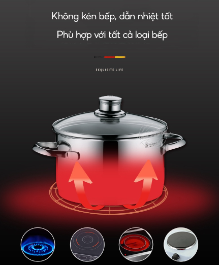 - Đáy TransTherm- Allherdboden với khả năng phân phối nhiệt đều và lưu trữ nhiệt mở rộng để nấu ăn hiệu quả, tiết kiệm năng lượng. Dùng được cho mọi loại bếp, kể cả bếp từ.