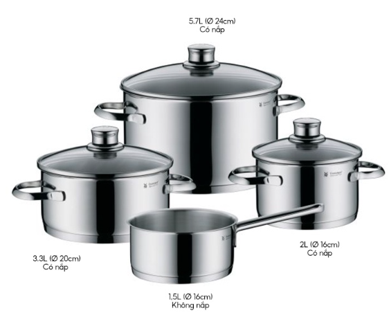 + 3 nồi có nắp: 5.7L (Ø 24cm) - 3.3L (Ø 20cm) - 2L (Ø 16cm)