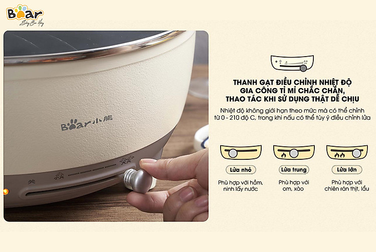 Sau khi đồ ăn chín dần, bạn có thể tùy chỉnh nhiệt độ bằng cần gạt thông minh với thao tác rất dễ dàng, gạt trái để giảm nhiệt (phù hợp với hầm minh lấy nước), gạt phải để tăng nhiệt (phù hợp với lẩu, chiên và rán), dừng ở giữa để giữ nhiệt trung bình (phù hợp với om và xào).