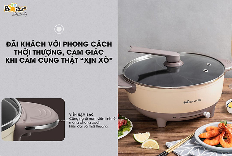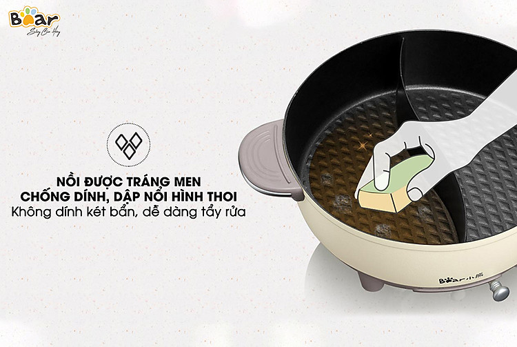Nồi lẩu uyên ương Bear DHG-B60R6 sở hữu thiết kế hiện đại với hân nồi màu beige thanh lịch kết hợp với tay cầm nâu sữa viền nạm bạc tinh tế giúp tổng thể nồi trông vô cùng sang trọng. Nếu chị em nào đam mê decor góc bếp và bữa ăn trong gia đình thì một em nồi lẩu xinh xắn như này quả thực là lựa chọn hàng đầu, không thể bỏ qua.