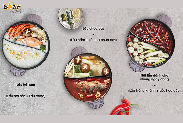 So với các nồi lẩu truyền thống chỉ có 1 ngăn thì nồi lẩu uyên ương Bear DHG-B60R6 cải tiến được thiết kế 2 ngăn rất tiện lợi. Bạn có thể dễ dàng chế biến 2 loại nước lẩu khác nhau, có thể là 1 ngăn lẩu thái chua cay, 1 ngăn lẩu hải sản ngọt bùi để các thành viên thoải mái lựa chọn khẩu vị phù hợp với mình. Bên cạnh đó, vách ngăn được thiết kế liền vào nồi, rất chắc chắn để đảm bảo 2 vị nước lẩu không bị trộn lẫn vào nhau và giữ trọn vị ngon ở từng ngăn.
