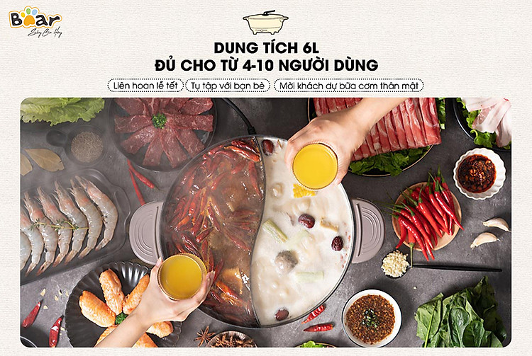 Sở hữu dung tích lên đến 6 lít, nồi lẩu uyên ương Bear DHG-B60R6 thích hợp sử dụng cho gia đình và những bữa tiệc nhỏ từ 4 đến 10 người. Dung tích lớn, thiết kế 2 ngăn thông minh kèm công suất mạnh nồi lẩu uyên ương Bear giải quyết nhược điểm và hạn chế của các dòng nồi lẩu uyên ương kích thước nhỏ không phù hợp dùng cho gia đình đông người đang có trên thị trường.